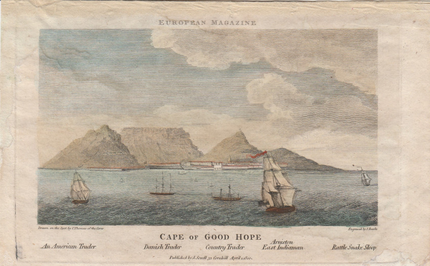 The small prospect was published in the European Magazine, a monthly magazine, that was published from 1782 until 1826 - it competed against the longer lasting Gentleman's Magazine - the first two decades published by John Sewell, mentioned in the imprint. The prospect was drawn by the aritist, C. Thomas, aboard HMS Ceres, an East India Company Eastindiaman, under command of George Stevene, that was on its second return second voyage from the Far East.