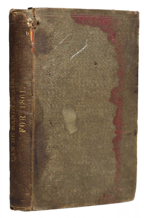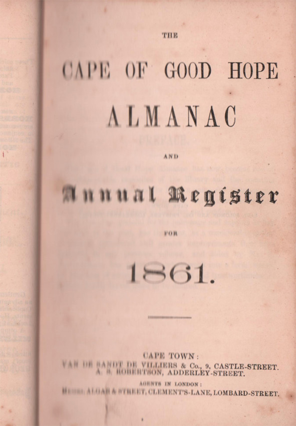 20 pages of English adverts, xxii, 262 pages, directory of Cape Town- unpaginated [93] pages, 60 pages of local adverts, brown cloth boards with water stains, titled gilt on the spine, which is starting to wear, a good copy.