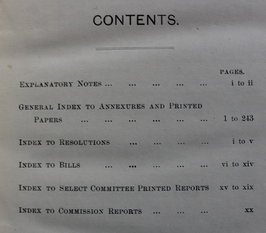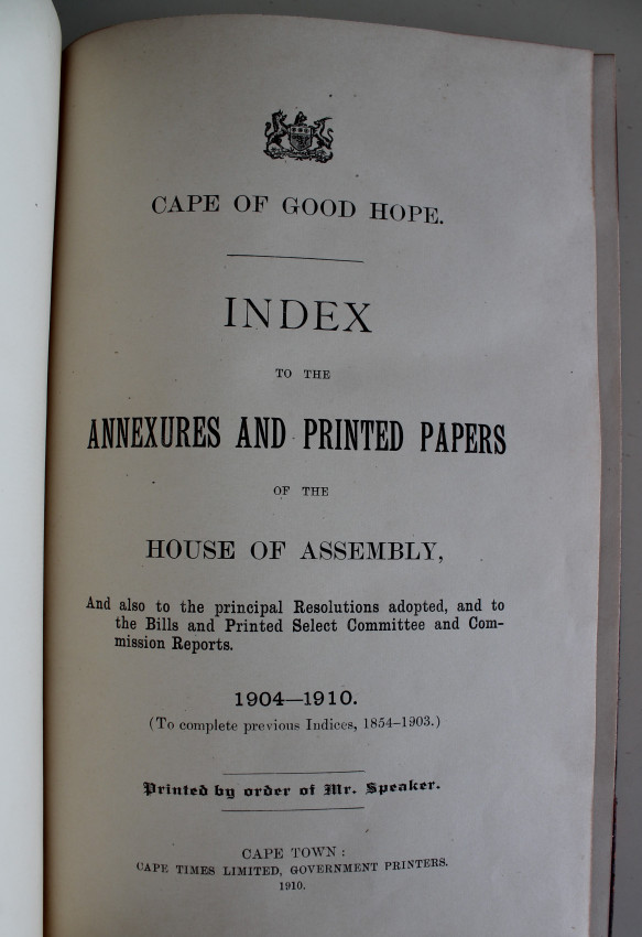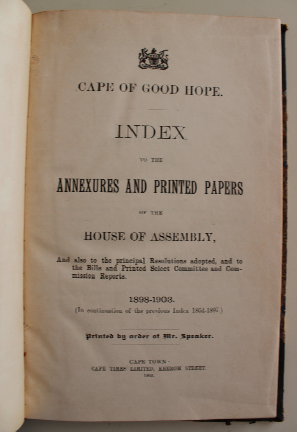 2. An extra copy included in this sale: Index to the Annexures and Printed Papers of the Assembly 1904-1910. The spine of this copy is missing. Full leather. The content still bright and clear. Marbled end papers. Printed 1910. Pages 243.