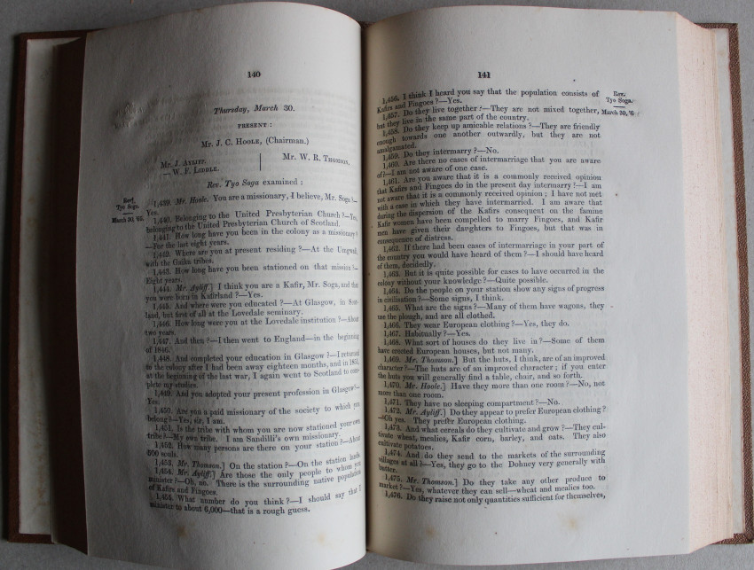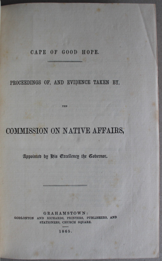 Octavo. Brown cloth. Gilt tiles to spine. 1/2 title xxvii + 177 pages + two appendices 213 pages & 86 pages. Ex-Libris F.W. Hosken with his bookplate on the front paste-down. Slight foxing on first and last 4 pages. The minutes of evidence are a valuable source of information on the system of administration applied to tribes in the Colony and the treatment of Native customary law. - (Schapera I. Select Bibliography of South African Native Life and Problems - 1941) An early print from Grahamstown. Robert White, partner in the firm Godlonton, White & Co., left for England and the partnership became Godlonton & Richards. The new partner was W.A. Richards, stepson of Robert Godlonton. (South African Printers and Publishers 1795-1925 - Fransie Rossouw)