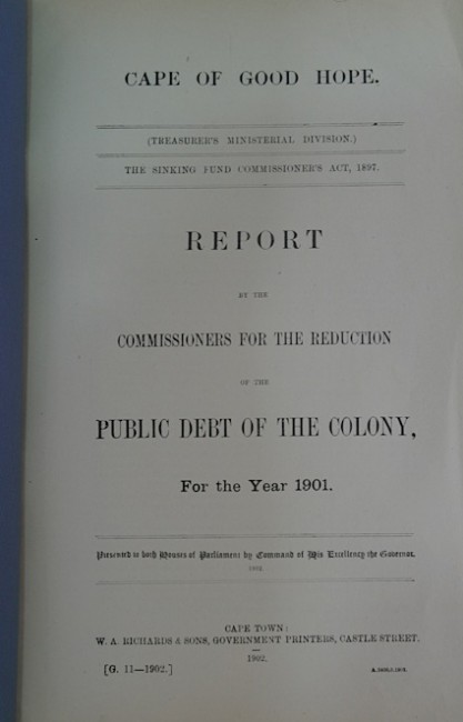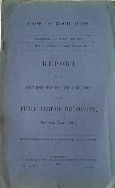 Cape of Good Hope (Treasurer\'s Ministerial Division). The Sinking Fund Commissioner\'s Act, 1897. Report by the Commissioners for the Reduction of the Public Debt of the Colony for the year 1901. Presented to both Houses of Parliament by Command of His Excellency the Governor. 1902.