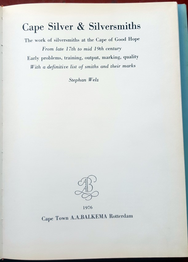 Early problems, training, output, marking, quality. With a definitive list of smiths and their marks. xi, 172p. Illustrated throughout with 170 photographs. Dust jacket is slightly rubbed around the edges with some bumping to corners. Comprehensive history of Cape Silver and its silversmiths.
