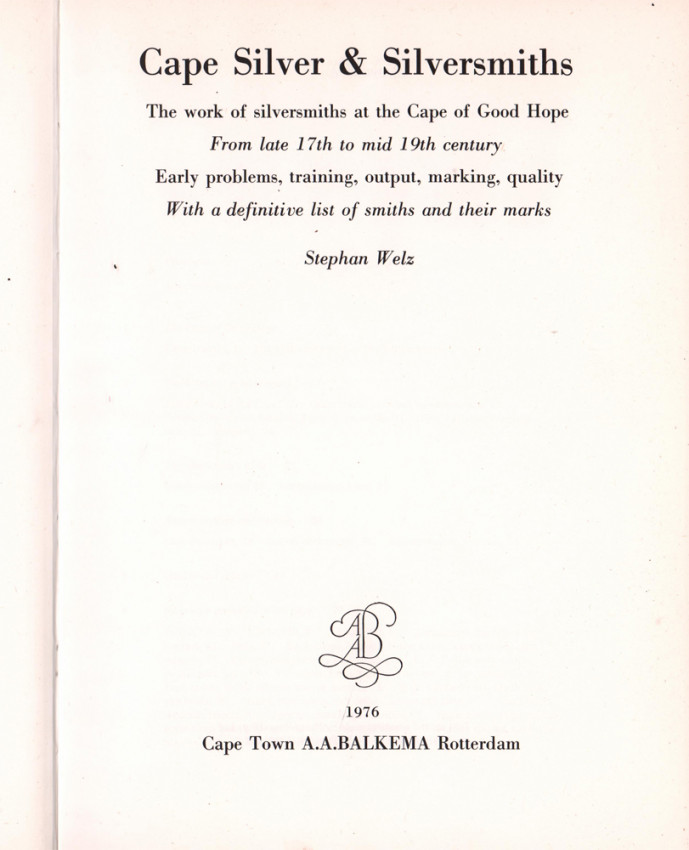 This book is described as an important contribution to the study of Cape Silver. It includes biographical information on Cape silversmiths, a record of the marks used by silversmiths and a survey of objects made from late 17th to mid-19th century.