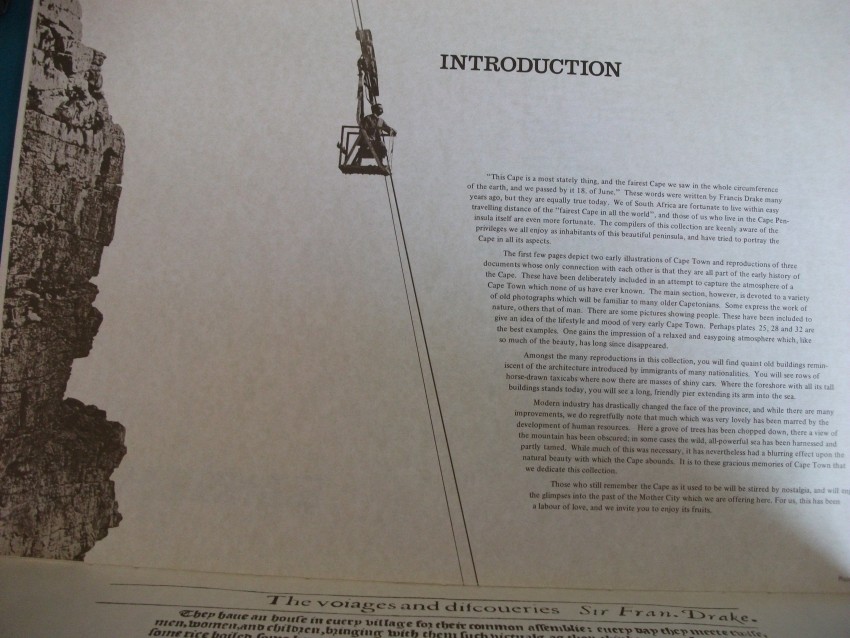 The photographs and other reproductions illustrate Cape Town's history from the time of Drake's voyage ("the Fairest Cape") to 1917 (a Claremont Cinema). Most are from the Cape Archives, with archive references on the contents page. All have their own particular interest so it is perhaps invidious to single out the early cable way, some of the street scenes, bringing in the catch at Roggebaai and the 1836 treaty between the Governor of the Cape and Chief Umsiligas (Moselikaze).