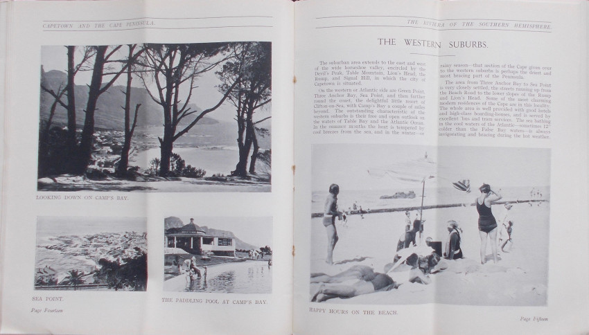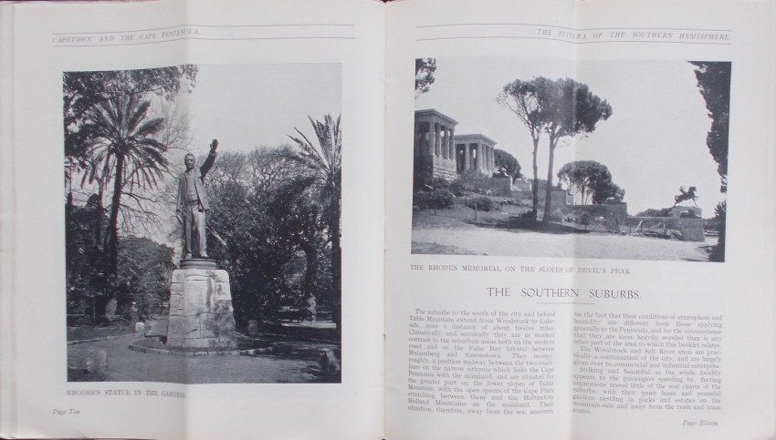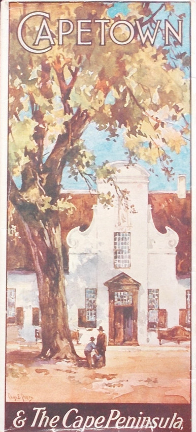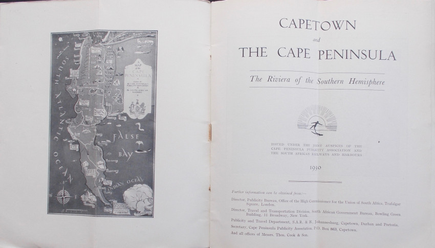 32pp with a black and white frontispiece, 30 other black and white illustrations and a map on the side of the rear cover. Very good published’s original illustrated thin card covers with titles in white on the front cover. Stapled at spine. Staples a little rusty. Internally the text and illustrations are in very good (+) condition with no foxing, narks or other blemishes.This brochure measures 23cm x 10cm opens up to 23cm x 20cm. This means that there is a crease down the centre of the pages. This is how th this brochure was issued to make it easier to keep in a pocket. Contents include Civic Capetown, Climate, The Southern Suburbs, The Western Suburbs, Kirstenbosch National Botanic Gardens and The Peninsula Roads.