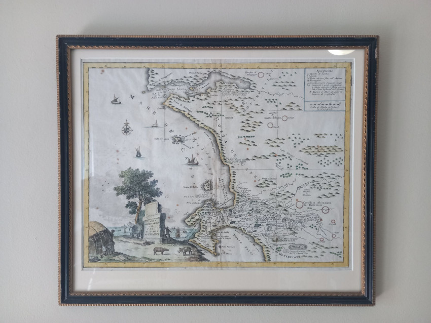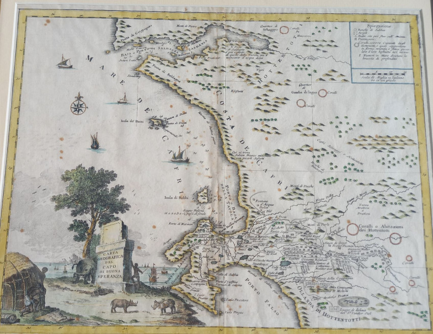 According to Dr Stewart: "Carta geographica del Capo di Bona Speranza first was published in 1740; this map came from the second edition of the Atlante Novissimo (1750). The engraver is not known, but, according to Scholte, the first edition of the Atlante Novissimo (1740) indicated that most of the maps were engraved by Isaac Tirion. However the only known copy of the first edition of the atlas was lost during the 1966 flood of the Arno River in Florence. This map is similar to a smaller map by Pieter Van der Aa: Le Cap de Bonne Esperance. Both maps are derived from a 1690 manuscript map produced by the VOC." Depicts a beautiful decorative engraving including elephant and rhinoceros, including their habitat further inland.
