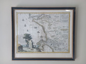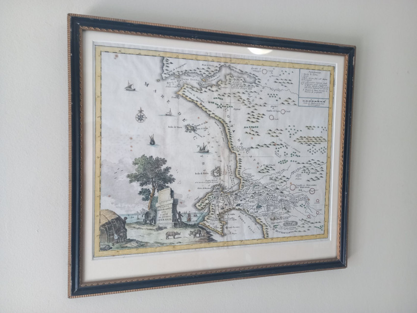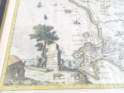 A scarce and beautiful hand coloured map of the second early expansion of the Cape of Good Hope Settlement beyond The Castle and Liesbeeck River and the Hottentots Holland mountain range. According to Dr Roger Stewart (as outlined in a previous listing on antiquarianauctions.com) the map is historically important because of the names some of the early settlers and their farms.