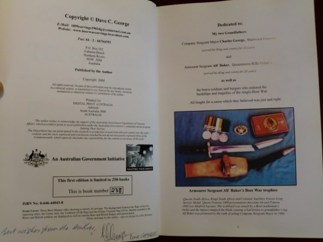 Book number 238 of 250 limited edition copies, signed by the author. A comprehensive selection of Boer War rifles, medals, pipes, documents, and other artefacts and memorabilia, were sourced to create this book, including many from the author's own collection. Book condition: softcover wrappers, contents and binding in excellent condition, with the usual rubbing and slight wear to the edges.