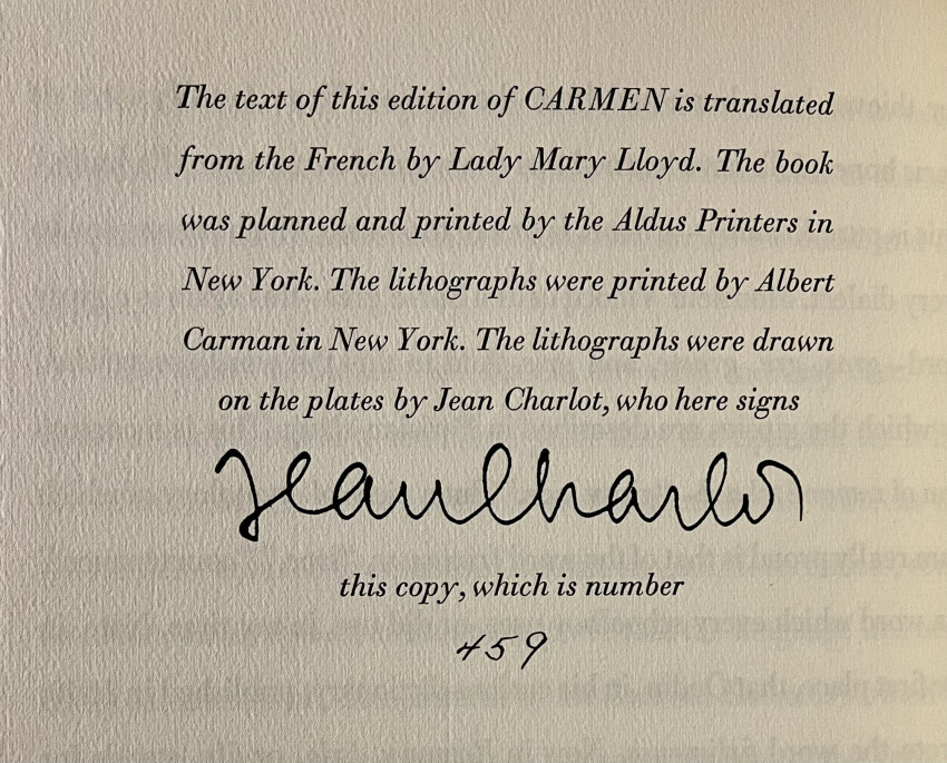 Machen, Arthur (trans). LEC: 1940. 8 vol set in 2 slipcases. Illustrations by Rene Ben Sussan (signed); Black slipcases, gilt bordered box with gilt lettering inside on the spines. Red buckram over decorative red and tan boards with gilt lettering on spines. 1477/1500. - Carmen. By Prosper Merimee. LEC: 1941. Translated by Lady Mary Lloyd. Illustrated with 37 lithographs drawn by Jean Charlot (signed); In a slipcase that has some wear and chipping. #459.