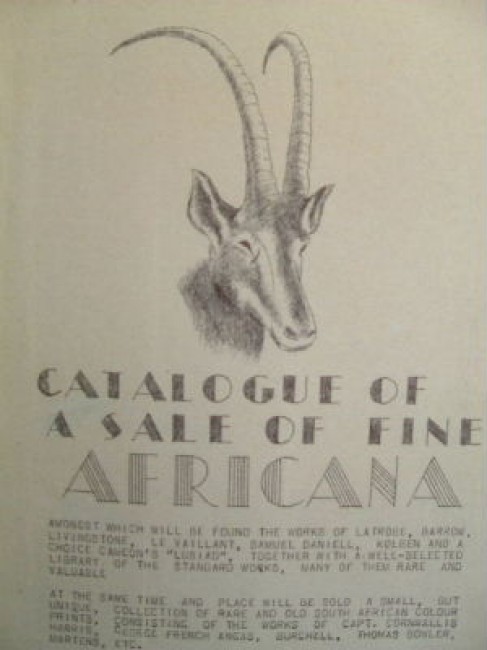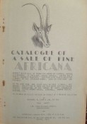 Full title: \"Catalogue of a sale of fine Africana amongst which will be found the works of Latrobe, Barrow, Livingstone, Le Vaillant, Samuel Daniell, Kolben and a choice Camoen\'s \"Lusiad,\" together with a well-selected library of the standard works, many of them rare and valuable ... at the same time and place will be sold a small, but unique, collection of rare and old South African colour prints, consisting of the works of Capt. Cornwallis Harris, George French Angas, Burchell, Thomas Bowler, Martens, etc. ... to be sold by public auction on behalf of a private collector ... on Wednesday, August 26th, 1936 at 2.30 p.m. ...\" Cyclosyled catalogue of 10 pages in the original printer wrappers, with neat pencil prices entered for all 131 lots. A choice collection of Africana. Recently re-stapled down inner-hinge, some slight margin tears, paper browned