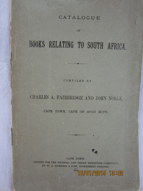 42 pages : compiled by Charles A Fairbridge & John Noble for the Exhibition Committee from books in the Cape Town Public Library or the private collection of Mr Fairbridge of Sea Point, arranged alphabetically; thin card covers detaching, lacks backstrip, some entries have been pencilled through but all are clearly visible, errata slip present, g++ SCARCE EPHEMERA