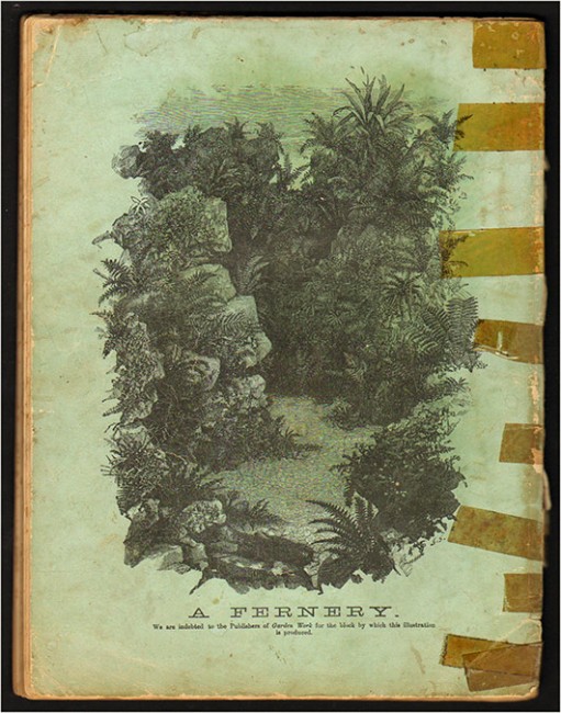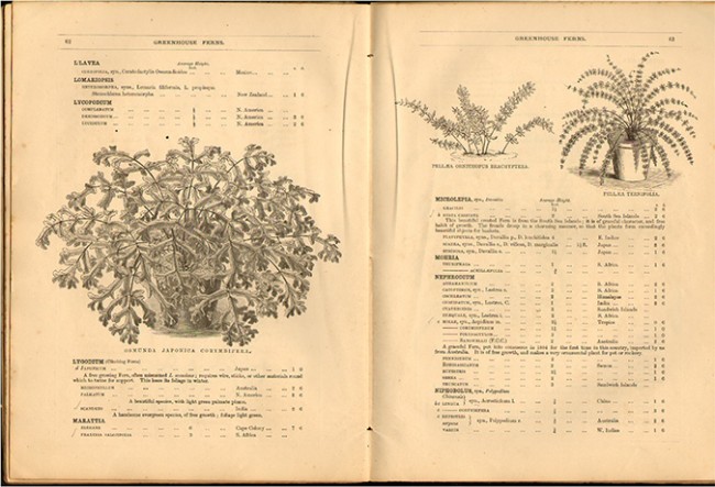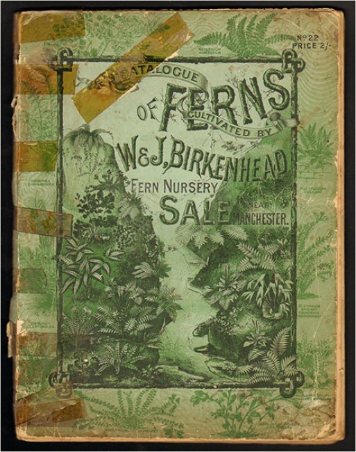 122 pages, many engravings of ferns illustrate the price lists, pictorial paper covers – very worn and poorly repaired with tape, foxing on the page edges.