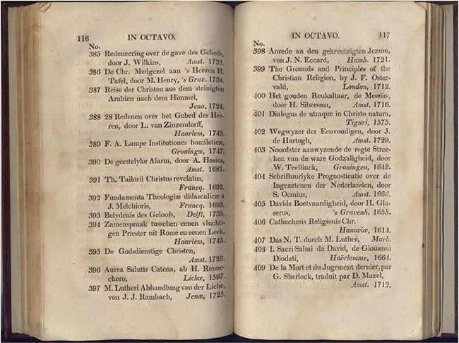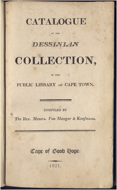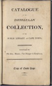 209 + 8 pages index (lacks pages 9 - 36 of the index), original blue paper-covered boards laid down and bound in, some foxing and staining throughout, bookplate on the front paste-down endpaper. Mendelssohn (S.) South African Bibliography, volume 1, pages 973/4, \'This collection of books, with a few manuscripts and paintings, was bequeathed by Mr. Joachim Nicolaas Von Dessin to the City of Cape Town, in the year 1761, to "serve as a foundation of a public library for the advantage of the community." The collection possessed 4565 volumes, but few of these relate to South Africa.\'