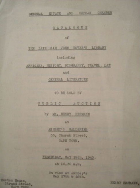 A cyclostyled auction catalogue of (i),19 pages, recently re-stapled down left margin. A public auction by Mr. Henry Hermann, at Ashbey\'s Galleries, 35 Church Street, Cape Town, on Wednesday, May 29th, 1940. Contains 353 lots of general works but including some very unusual items of Africana. No covers (as issued ?)