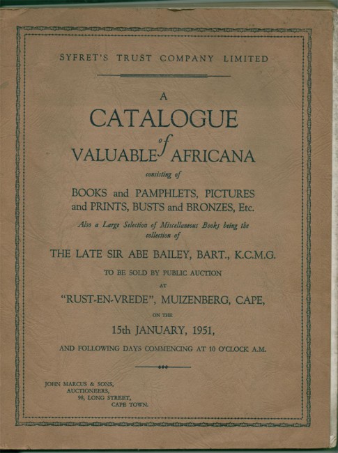 Bailey, Sir Abe. CATALOGUE OF VALUABLE AFRICANA, ETC: [consisting of books and pamphlets, pictures and prints, busts and bronzes… being the collection of the late Sir Abe Bailey: to be sold by public auction at \"Rust-en-Vrede\", Muizenburg, Cape on the 15th January 1951 and following days… John Marcus & Sons, Auctioneers]. Cape Town: Syfrets Trust, 1951.