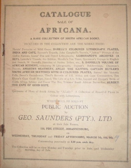A wonderful catalogue of Africana books offered for sale by Geo. Saunders (Pty) Ltd at their sale rooms, 110, Fox Street, Johannesburg on Wednesday, Thursday & Friday afternoons, March 7th, 8th, 9th - no year given, but most likely 1930s. List 444 lots, including many ratrities as well as the \"usual\" serious collectables by among others Daniell, Angas, Andrews, Alberti, Baines, Latrobe, Dapper, Ten Rhyne, etc.. There is a foreword by W.R. Morrison inside the front cover. No estimates or prices realised are given. 4to. Printer wrappers. Pp. 34, cyclostyled, stapled into plain printed wrappers, staples rusted, paper browned.