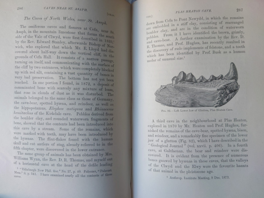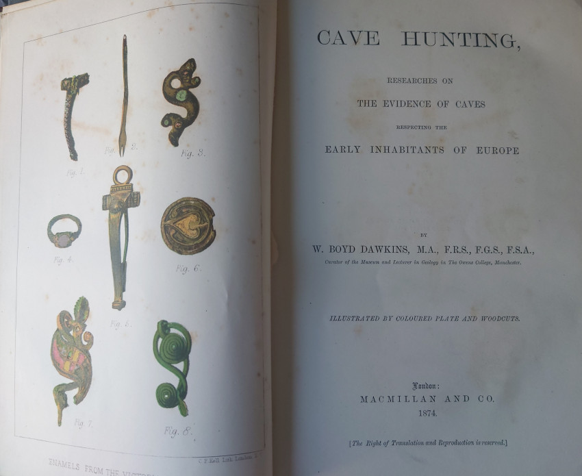 London : Macmillan and Co., 1874. Hardcover. Condition: Very Good. Coloured Plate & Woodcuts (illustrator). First Edition. The definitive 19th century volume on cave hunting. Copiously illustrated w/ textual woodcuts. By the curator of the Museum and Lecturer in Geology in the Owens College, Manchester. Original Full Maroon Pictorial Cloth Binding. The front board ruled black and gilt containing a stamped pictorial vignette of stalactites and stalagmites. The spine with gilt lettering and extras. Top edge gilt. Slight wear to top head of spine. Colour frontispiece with tissue guard. Numerous black and white ills within the text. Some light scattered foxing.