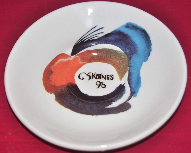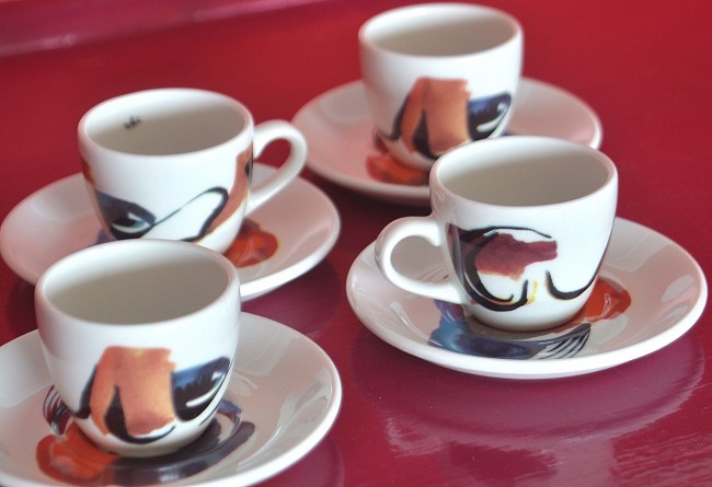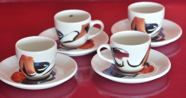 A set of four Cecil Skotnes designed Espresso Cups and Saucers made for La Perla restaurant in Cape Town in 1996. Known as 'The La Perla Skotnes Collection' each saucer has the signature of Cecil Skotnes and the date. The set was made for La Perla by Continental China in Kuils River.