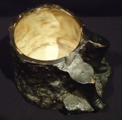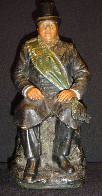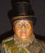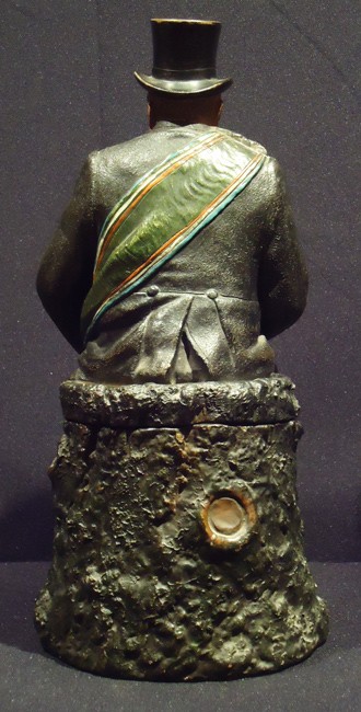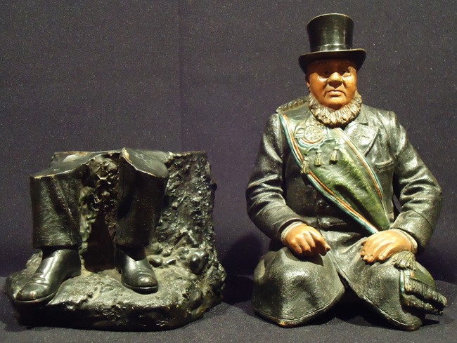 Kruger is dressed in a long coat with the presidential sash over his shoulder and wearing a top hat. The statue separates at the top of the stump the base forming the jar or humidor.
