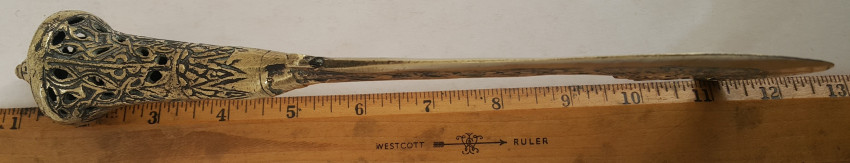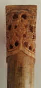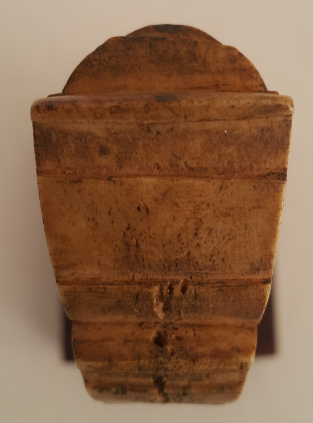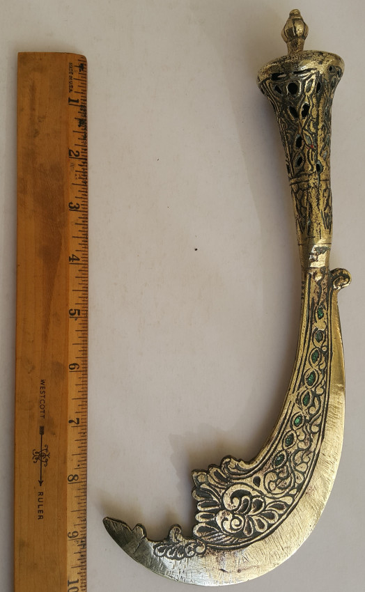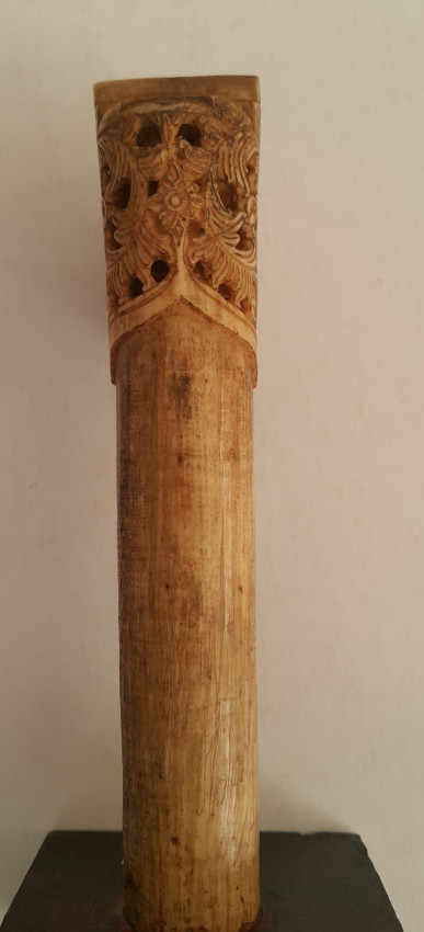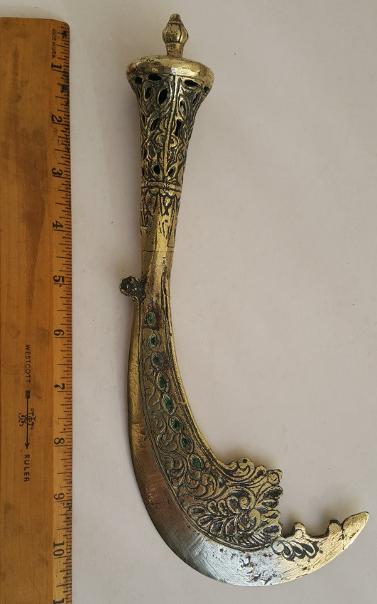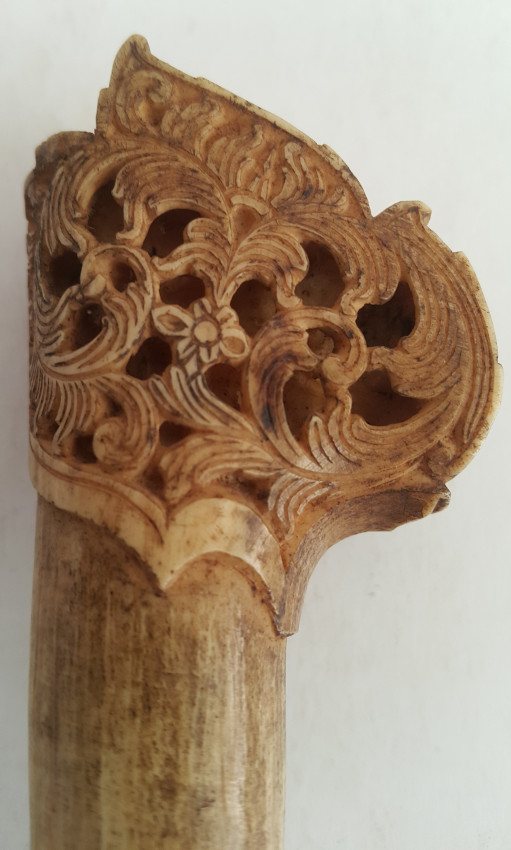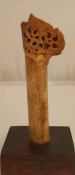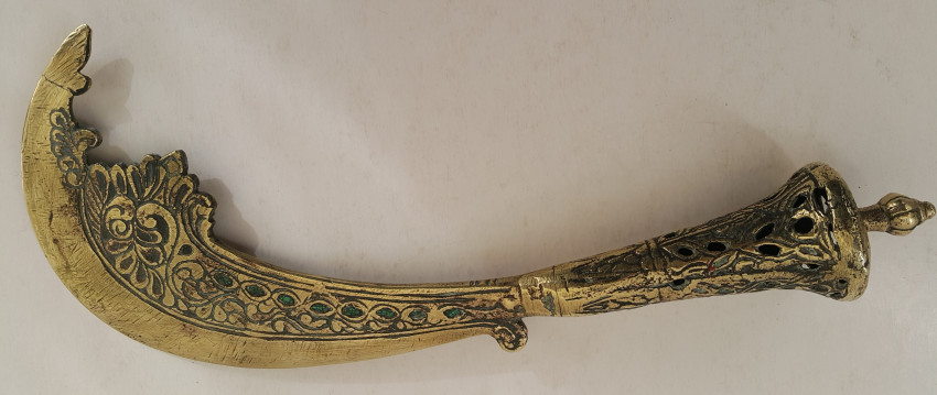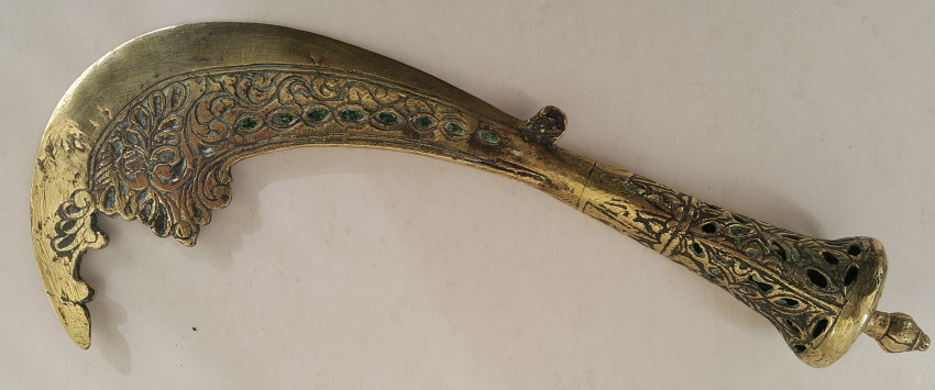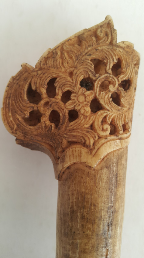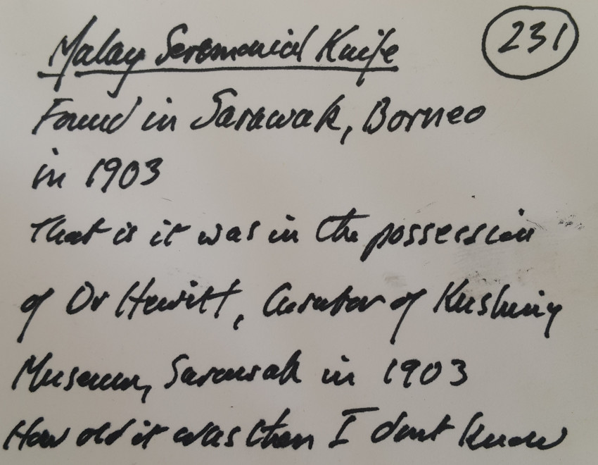 A Malaysian ceremonial knife which was in the possession of Dr. John Hewitt, curator of the Kuching Museum in Sarawak, in 1903. There is a little lead ball inside the handle which produces a rattle when the knife is held in dance. Also a beautifully carved bone sword hilt from Kuching, Sarawak, collected about the same date.