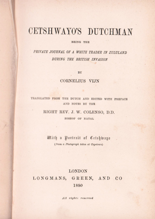 Mendelssohn (Sidney) South African Bibliography vol 11 page 568: The experiences of a young Hollander trader in Zululand during the war with Cetywayo. Mr. Vijn had resided for over four years in South Africa when he wrote his journal, and during the greater part of this period he had been engaged in trading in Zululand. His work throws some light on the character and conduct of the Zulu king, and appears to be written in an entirely unbiased manner. More than half the volume consists of notes contributed by Bishop Colenso, which afford considerable information regarding the state of the country and its inhabitants at this period.