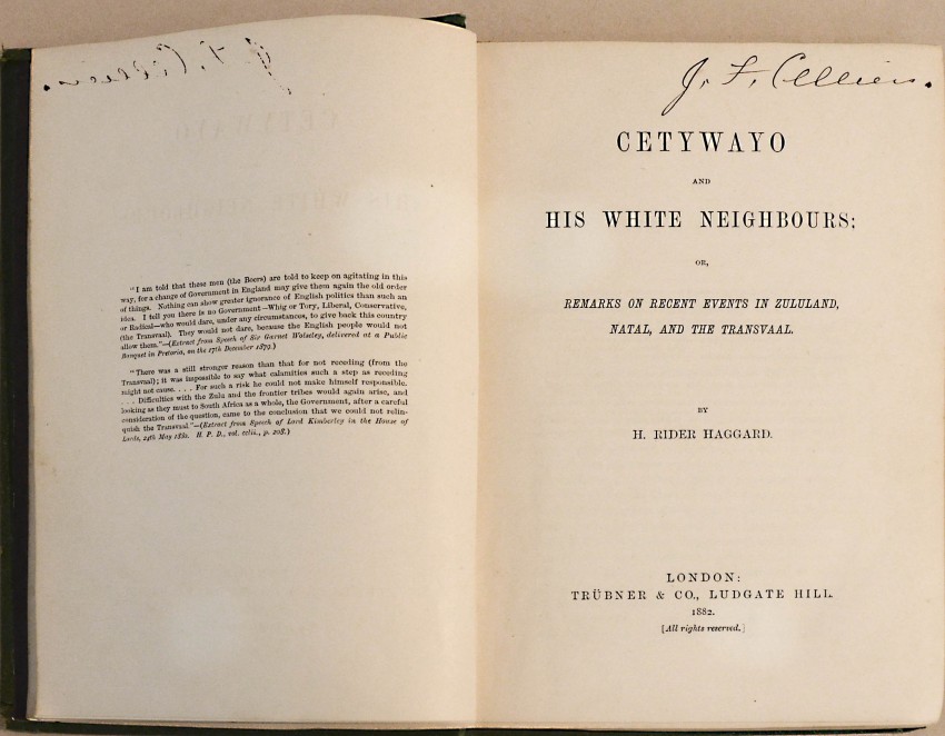 The scarce first edition of Rider Haggard’s first book and one of only 750 copies. This copy has an interesting provenance, being from the library of the Afrikaans poet, Jan F. Celliers, with his signature on the title page.