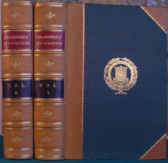 These volumes are not encyclopaedias, but they rather present information on the more important sections of general knowledge to afford the means of self-education. Two volumes, bound in splendid half calf with the gilt crest of the Kimberley Public school on the front cover. Generally very good condition, though two pages have a tear running from the margin into the text without loss. 824 + 824 pp with text illustrations, presentation certificate in prelims