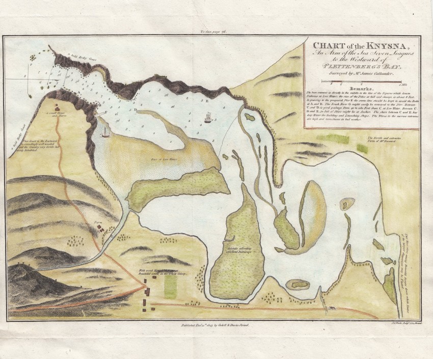A tastefully coloured example of this chart of The Knysna lagoon at the end of the 18th century, when it was still an active harbour. The chart was published in John Barrow's Travels in 1805 and again in 1806.