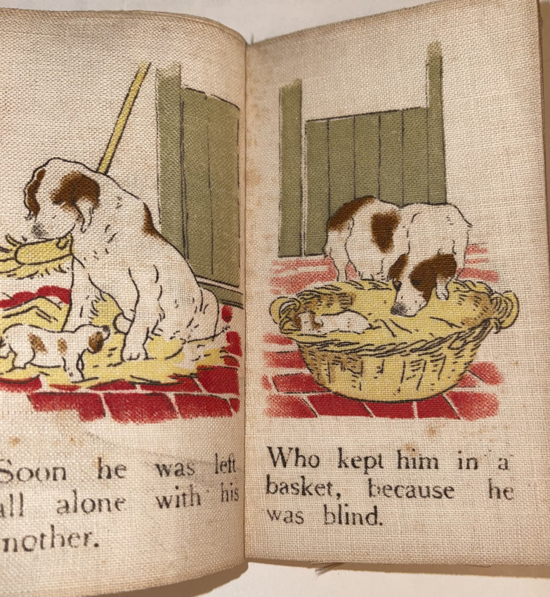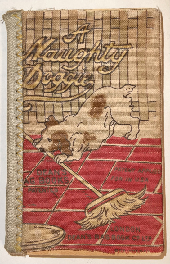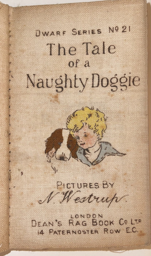 WESTRUP N. (c1900). The tale of the naughty doggie. London, Dean's Rag Book Co. Ltd. 24 unnumbered pages, printed on cloth, butterfly folded, color illustrations, 12 x 8 cm.