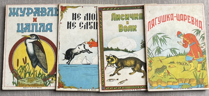 Collection of 4 early 20th Century Russian children's books, with colorful stiff paper covers; illustrations in black and white and some color; wear to covers, some soiling and scuffing, a few stains noted, but overall condition is good or better. Scarce.