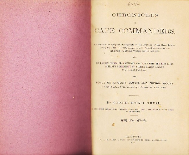 Sub-titled 'An abstract of original manuscripts in the Archives of the Cape Colony dating from 1651-1691, compared with Printed Accounts of the settlement by various Visitors during that time, also four short papers upon subjects connected with the East India Company's Government at a later period, reprinted from Colonial periodicals and NOTES ON ENGLISH , DUTCH, AND FRENCH BOOKS published before 1796, containing references to South Africa.