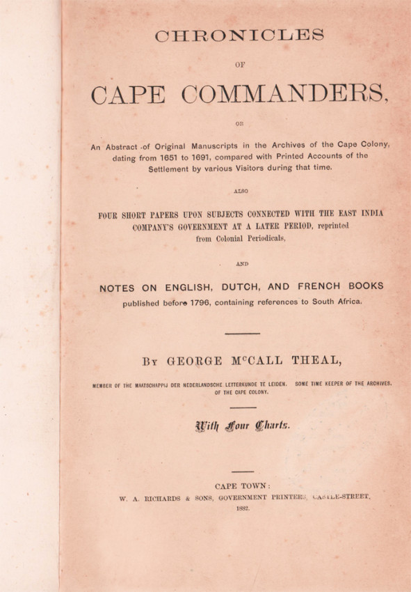 Mendelssohn (Sidney) South African Bibliography vol. 2 page 475: The first chapter serves as an introduction to the history of the Cape Colony, and is followed by a narrative of the rise and progress of the settlements under Van Riebeek, Wagenaar, Goske, Bax, Crudorp, and Simon Van Der Stel, together with instructive chapters on the exploration and discoveries in South Africa during this period, and details respecting the arrival and settlement of the Huguenots, and other interesting information.