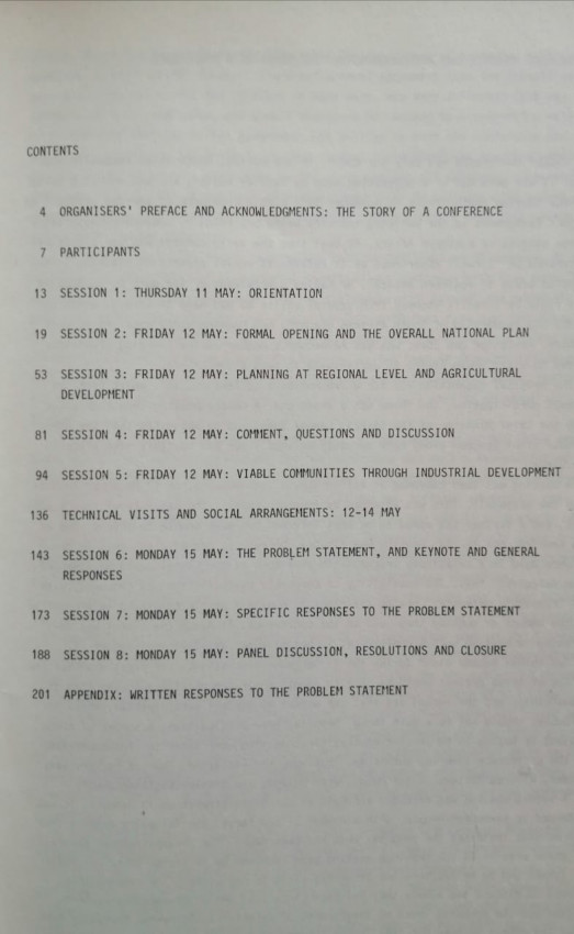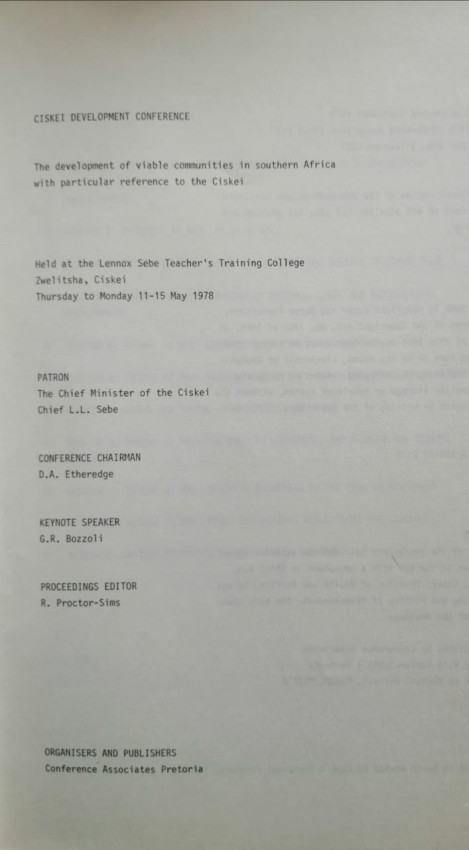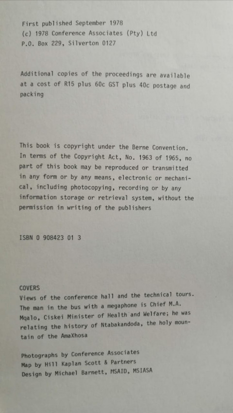 Laminated limp covers, illustrated with 9 colour photographs on both faces and with black lettering and a map which extends over both faces, black lettering to the spine, cover versos plain, drawn on to 208 pp of b/w text in thread-sewn sections, with the text including lists of steering committee members, sponsors and participants, as well as maps, figures and tables and, on p 142 (see image), the reproduction of a playbill (delegates were treated to a special performance of Lerner and Loewe's Camelot - the 100th performance of the production by the King William's Town Amateur Music and Dramatic Society, described as the oldest dramatic society in South Africa)