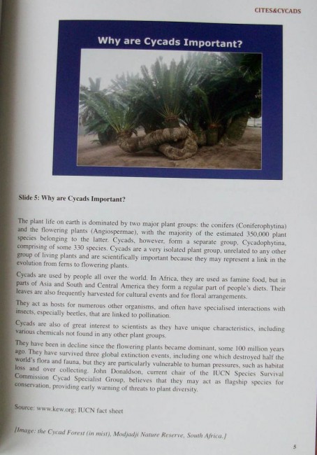 This guide has expanded speaker's notes for many of the PowerPoint slides included to provide a comprehensive coverage of particular topics. Most importantly, based on feedback from users of previous guides, we have printed the guide in full colour and in a larger format. We hope that this pack will allow users to tailor-make their own presentation on CITES and cycads and also form a concise but comprehensive reference. Please use this training tool and forward your comments to us so we can revise future editions to suit your needs.