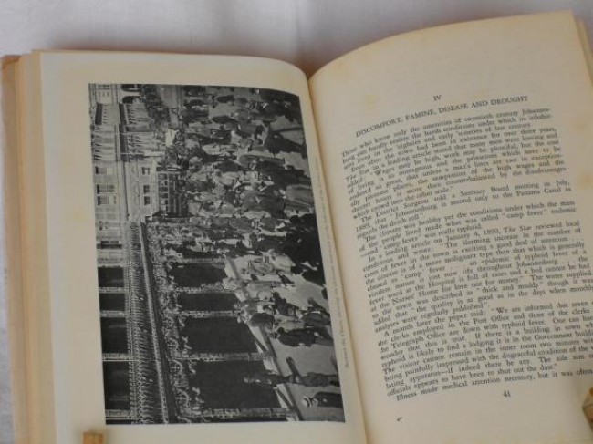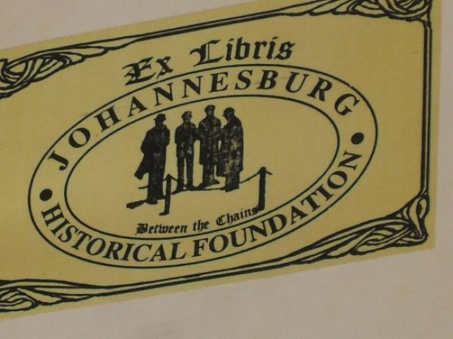 Clipped but otherwise complete and well repaired dustjacket; very good paper board covers, gilt embossed design to front and lettering to spine; plain endpapers with name on front paste-down covered with a while label, ex libris label (illustrated) on front free endpaper and back endpapers clean; vii + 248 pp including index + 12 pp of b/w plates, mostly from the 1890s but one close to the date of the book showing the Johannesburg city centre from the north (Berea) before the taller building were built and with the then splendid Joubert Park in middle ground.