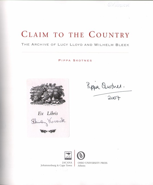 'In Claim to the Country Pippa Skotnes presents, for the first time, all the notebook pages and drawings that comprise the bulk of the Bleek & Lloyd archive. Also included is a searchable annotated index for all the narratives and contributors and several contextualising essays by well-known scholars. More than this, Pippa Skotnes has revealed both the beauty of the archive and the loss that it represents. She celebrates the enormous achievement of Wilhelm Bleek and Lucy Lloyd as well as the lives of the men and women and their children who struggled against unimaginable odds to survive, yet who filled the landscape with the poetry of their ideas and set their stories adrift on the wind. This book shows that more than a record of the memories of a few !xam and !kun individuals and the dispossession of their descendants, the archive is their claim to the country.' Editor's note.