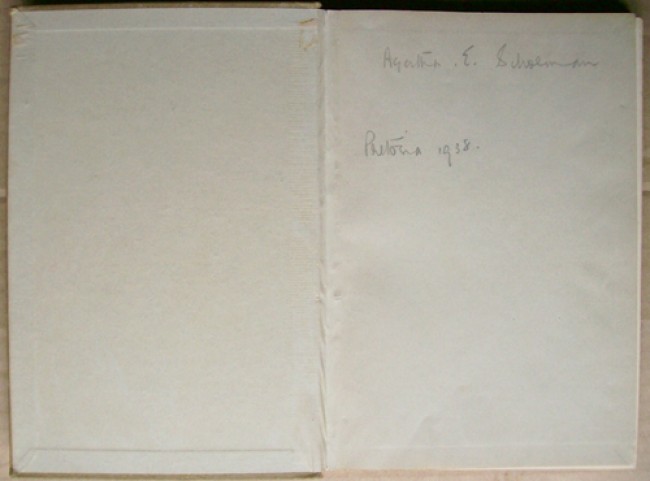Please see the image of the author\'s name written in pencil on the free front end paper and dated, Pretoria, 1938. It is not known whether or not it was written by the author. The buyer who has a sample of the author\'s handwriting is at an advantage.