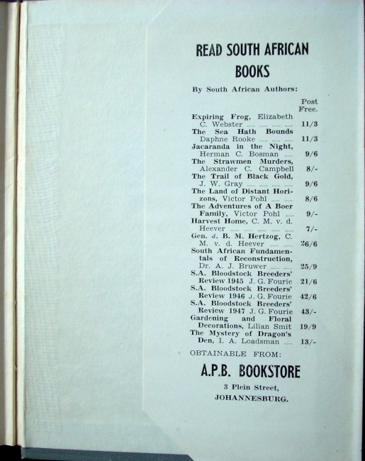 A.P.B. Bookstore, Johannesburg, 278 pages, minor tears to spine on dust jacket, 135 x 190mm, also some edgeware, internally, very good, overall condition: good.