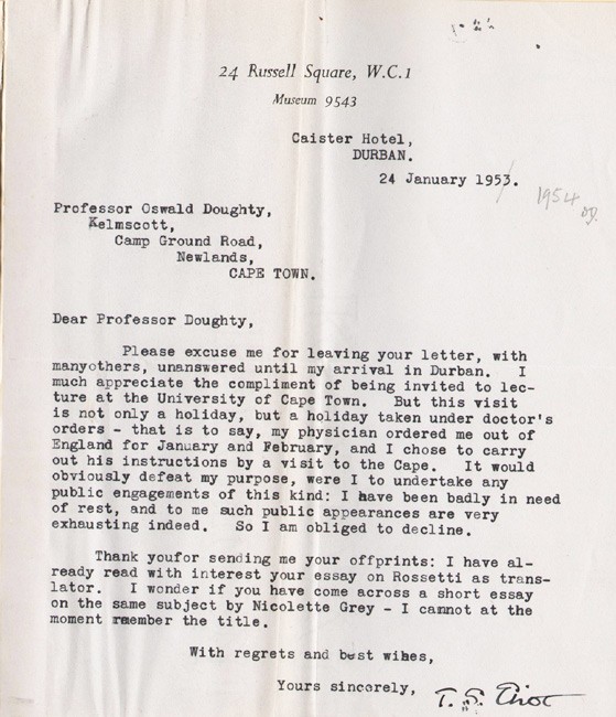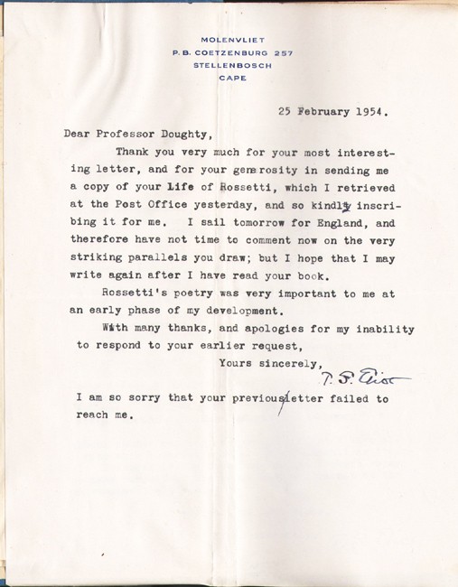 In the second letter written from Molenvliet, Stellenbosch on 25th February 1954, Eliot thanks Doughty for sending him an inscribed copy of his Life of Rossetti (sic). He continues, ‘I sail tomorrow for England, and therefore have not time to comment now on the very striking parallels you draw; but I hope that I may write again after I have read your book. Rossetti’s poetry was very important to me at early stage of my development.’