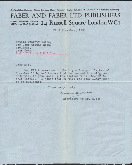 Eliot made two visits to South Africa. The first in 1950 and again in 1954, accompanied by Sir Geoffrey and Lady Faber, when he addressed a Foyle’s Literary Luncheon on Friday, 19th February at the Vineyard Hotel. Doughty attended this lunch.