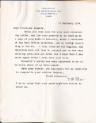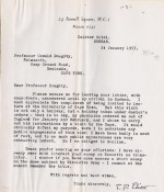 In the first, written from the Caister Hotel, Durban, 24 January 1953 (but corrected to 1954) thanks Doughty for his invitation to speak at the University of Cape Town during his forthcoming visit but declines on the ground of the advice of his doctor, ‘But this visit is not only a holiday, but a holiday taken under doctor’s orders – that is to say, my physician ordered me out of England in January and February, and I chose to carry out his instructions by a visit to the Cape. It would obviously defeat my purpose, were I to undertake any public engagements of this kind: I have been badly in need of rest, and to me such public appearances are very exhausting indeed. So I am obliged to decline.’