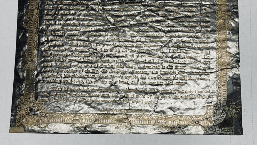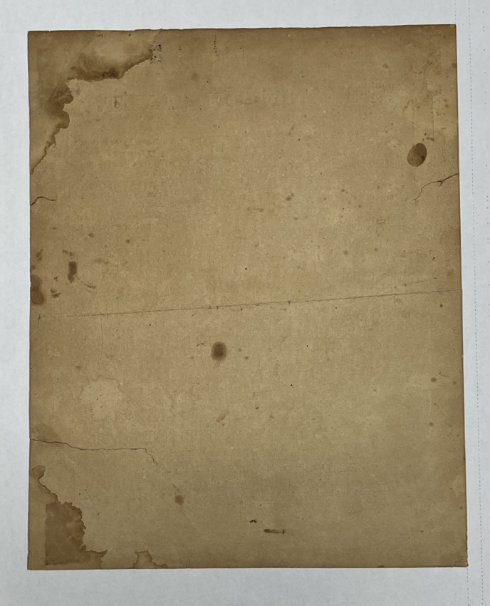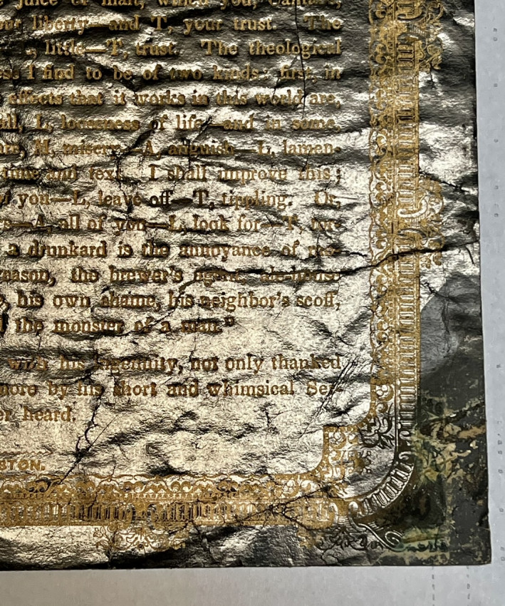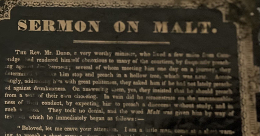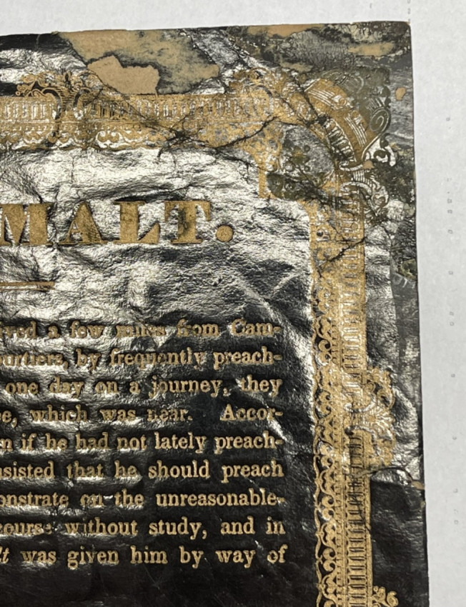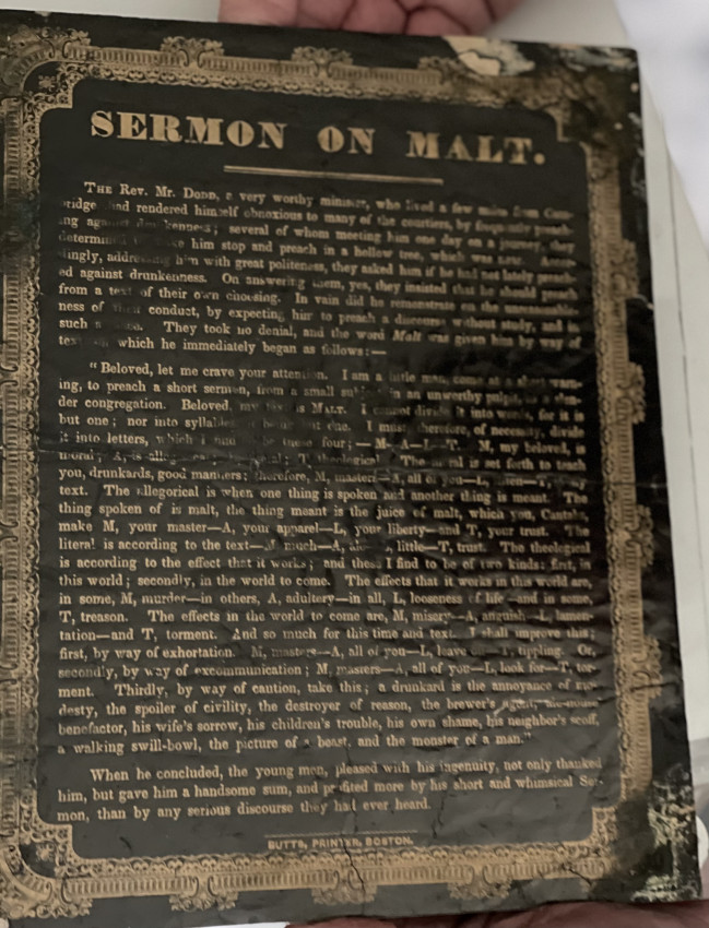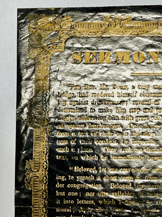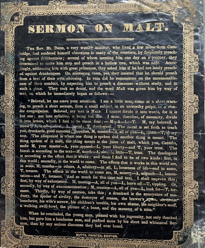 [ BROADSIDE; HUMOR] Sermon on Malt. Boston,: Butts, printer,( c. 1830s). Approx. 7 3/4 x 9 1/2 inches. Very delicate, thin paper, with a few cracks and tears, wear of some kind to the corners including chipping and loss of coating; stains. We were unable to locate any copies of the broadside, which reprints a comical anecdote found in various publications, including The Treasury of Wit. With Comic Engravings.London: Printed for T. Allman, 1836. The printer is possibly Isaac Butts, who also issued an early Emerson broadside.