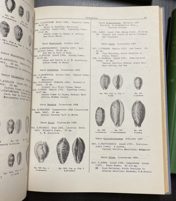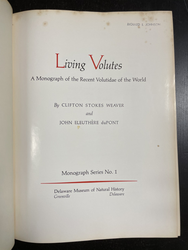 Clifton Stokes, and John E. Du Pont. Living Volutes: A Monograph of the Recent Volutidae of the World. Greenville: Delaware Museum of Natural History, 1970. xv, 375 pages : illustrations, maps, 79 color plates ; 32 cm. Blue cloth. VG. 79 Color plates on glossy stock.