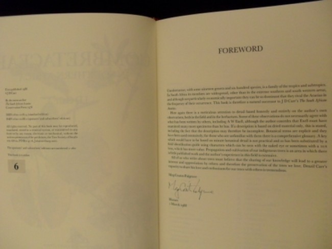 Two staff members of Fontein Books, Michael Barnett (designer and typographer) and Richard Proctor-Sims (editor), published Combretaceae of Southern Africa for the Tree Society of Southern Africa for a modest honorarium plus the right to produce and market a de luxe edition of six special copies, each a different colour goatskin, printed on Hahnemuele text paper with half-leather and marbled paper binding and solander boxes by Peter Carstens.