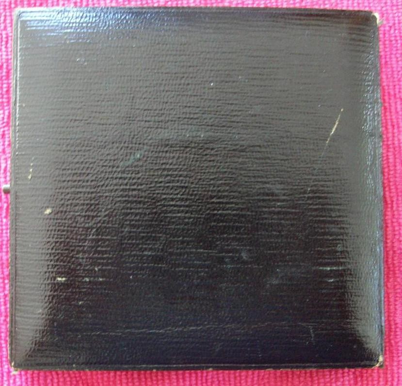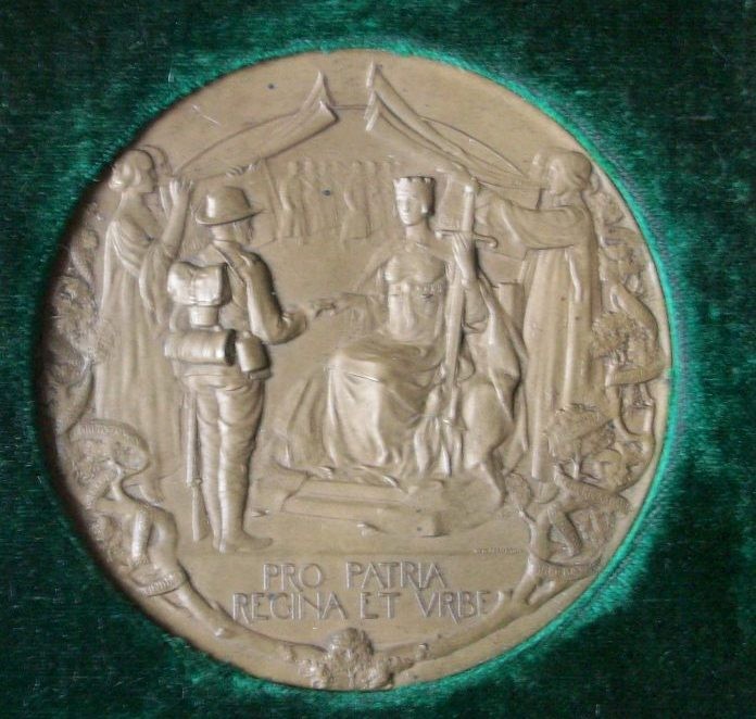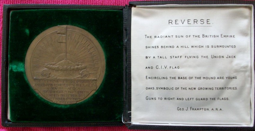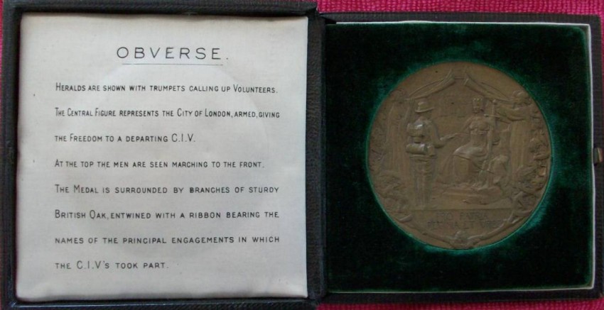Leather case with clasp, front of box inscribed and with gilt lettering and vignette. Silk and velvet casing. Medal in bronze. Front of medal marked Pro Patria. Regina et Urbe. The reverse, The City of London Imperial Volunteers raised and equipped for the War in South Africa, by the citizens of London formed , December 1899, returned to London, October, 1900.