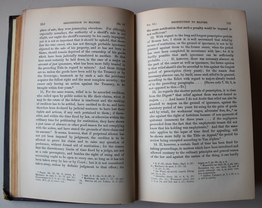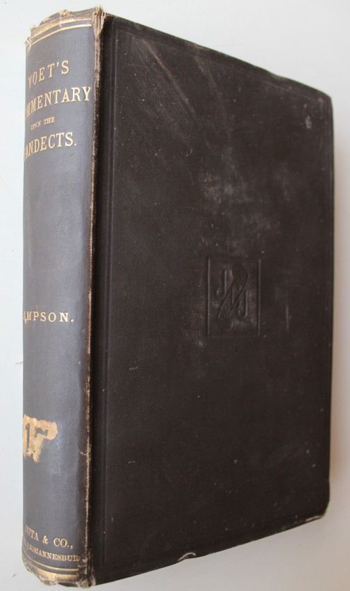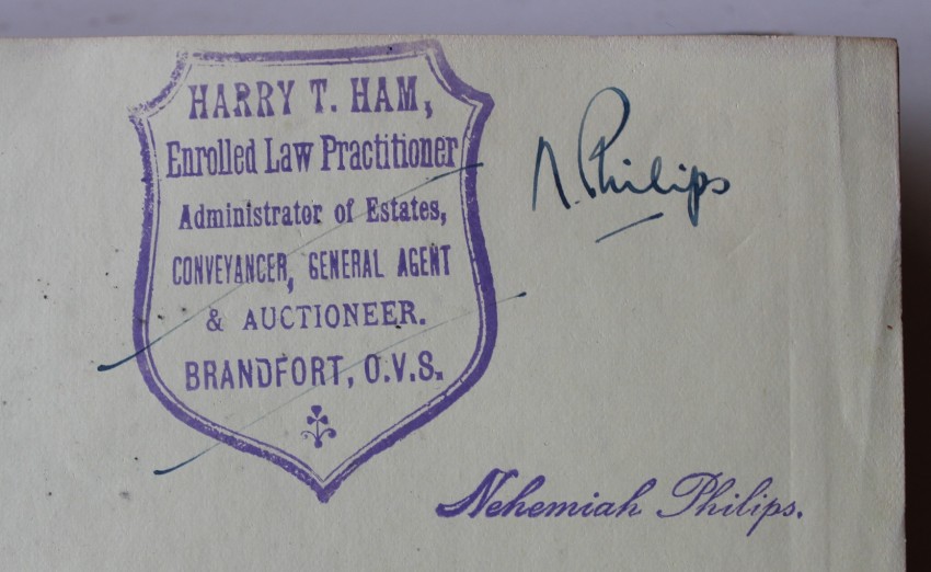 414 pages. Two stamps in ink of previous owner Harry T. Ham. He was an Enrolled Law Practitioner, Administrator of Estates, conveyancer, general agent & auctioneer from Brandfort, O.V.S. Also in front the name and signature of Nehemiah Philips.
