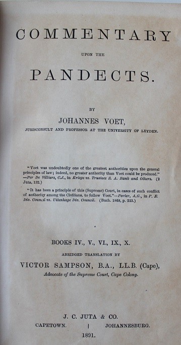 It is still an important source of South African law, the common law of which is Roman-Dutch. Sir Henry de Villiers, Chief Justice of the Cape Colony and later of South Africa, made much use of Voet's Commentary.