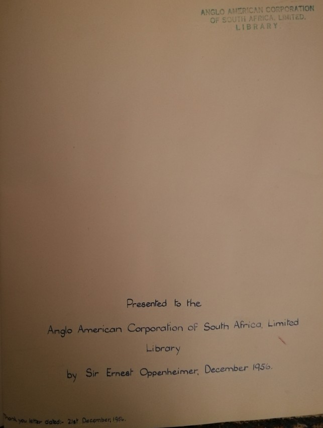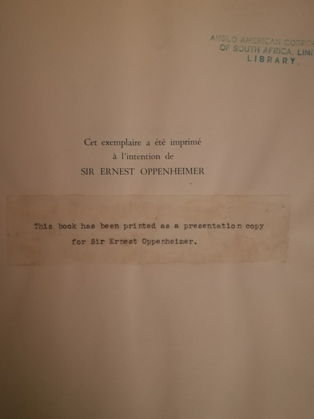 The copy in our lot was "specially produced . . . as a presentation copy for Sir Ernest Oppenheimer", who in December 1956 presented it "to the Library of the Anglo American Corporation of South Africa, Limited".