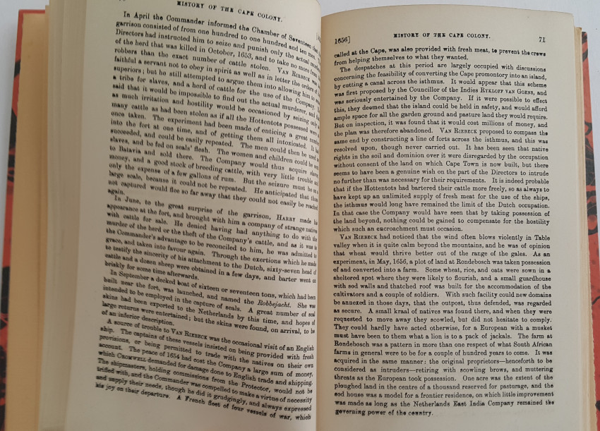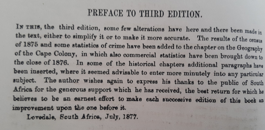 The demand for this book was very strong in 1877. The first publishing in two parts, five batch bindings and an issue were produced in one year! Theal contemplated publishing the third edition in parts of about eighty pages each and requested the Colonial Secretary to solicit the Governor's sanction, in terms of Section 2 of Act 9 of 1874, for these parts to be conveyed in the post at one penny each. He eventually abandoned the idea. (1)