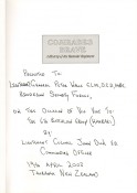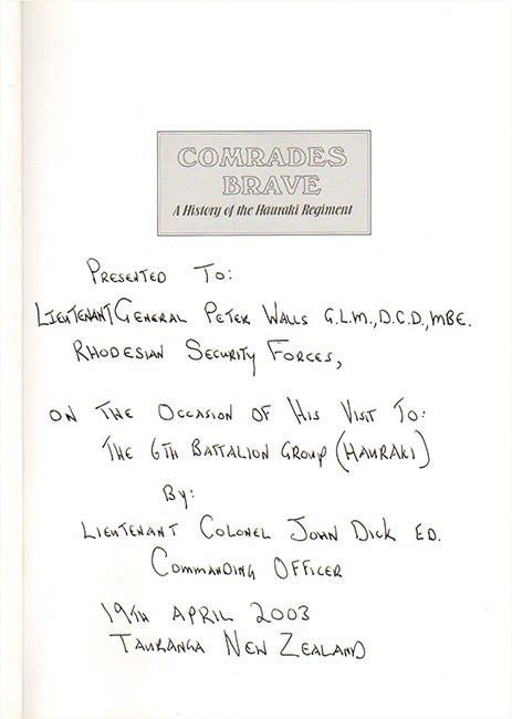 Presentation inscription on the half title page reads, ‘Presented to Lieutenant General Peter Walls, G.L.M., D.C.D., M.B.E., Rhodesian Security Forces, on the Occasion of His Visit to; The 6th Battalion Group (Hauraki) by Lieutenant Colonel John Dick, ED. Commanding Officer, 19th April 2003, Tauranga, New Zealand.’